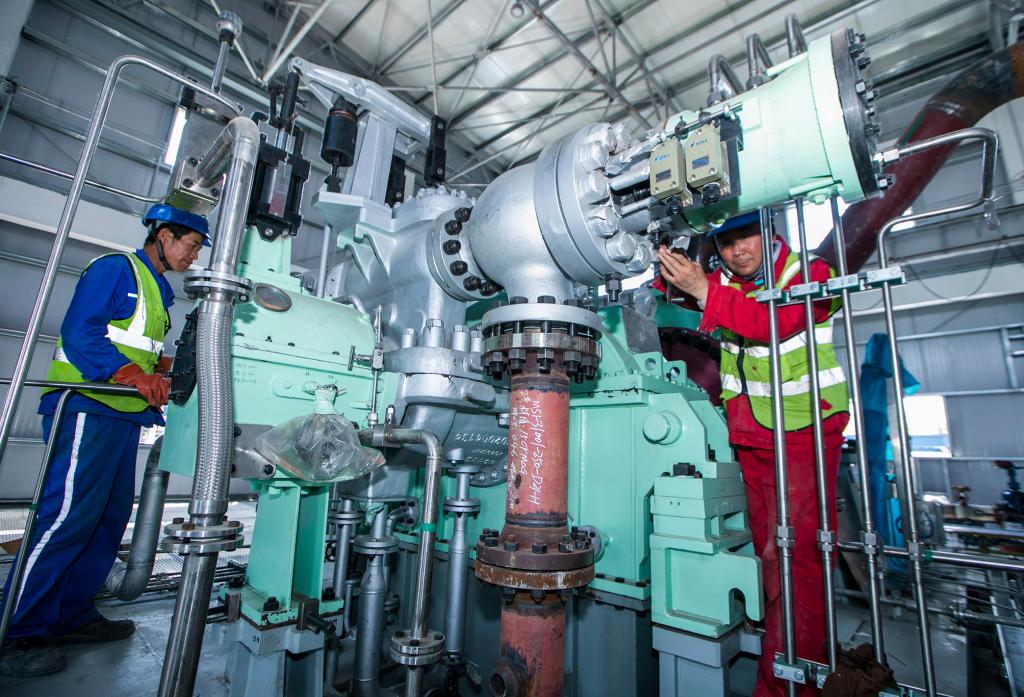 技術工人正在對合成氣壓縮機進行安裝調試