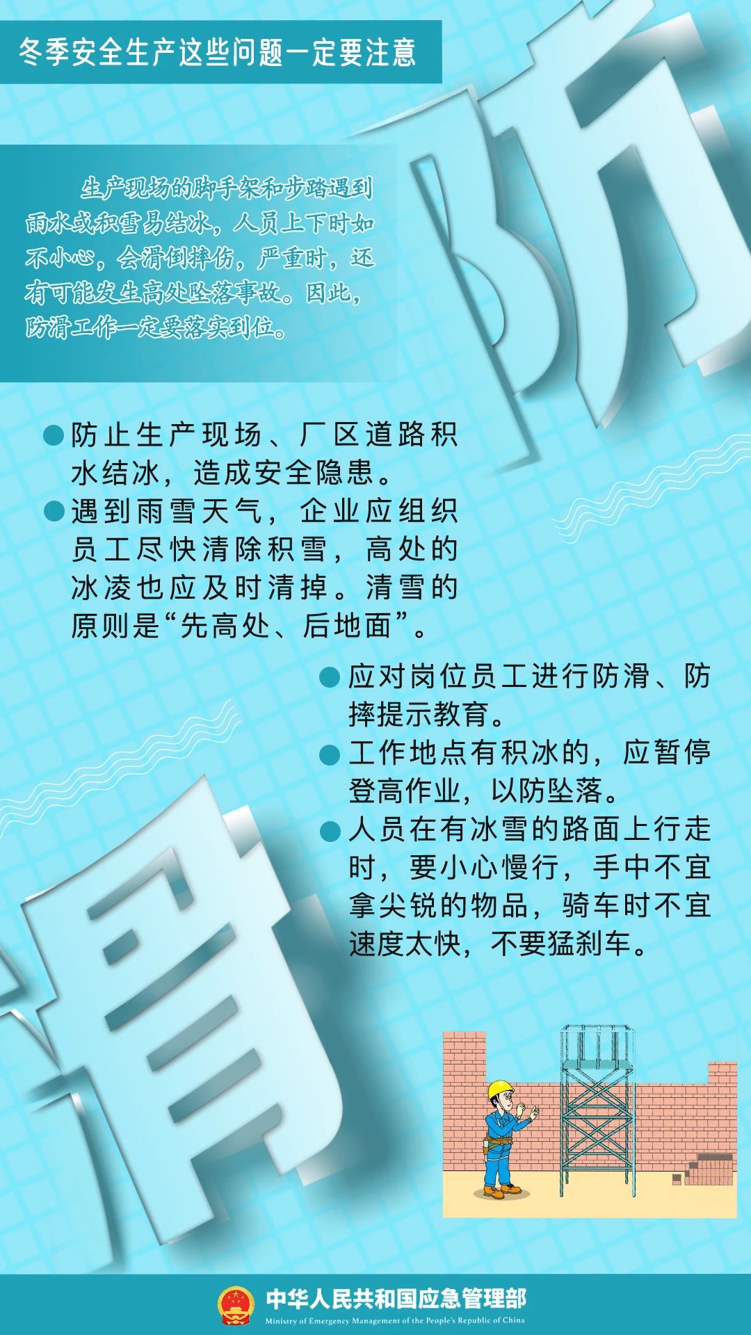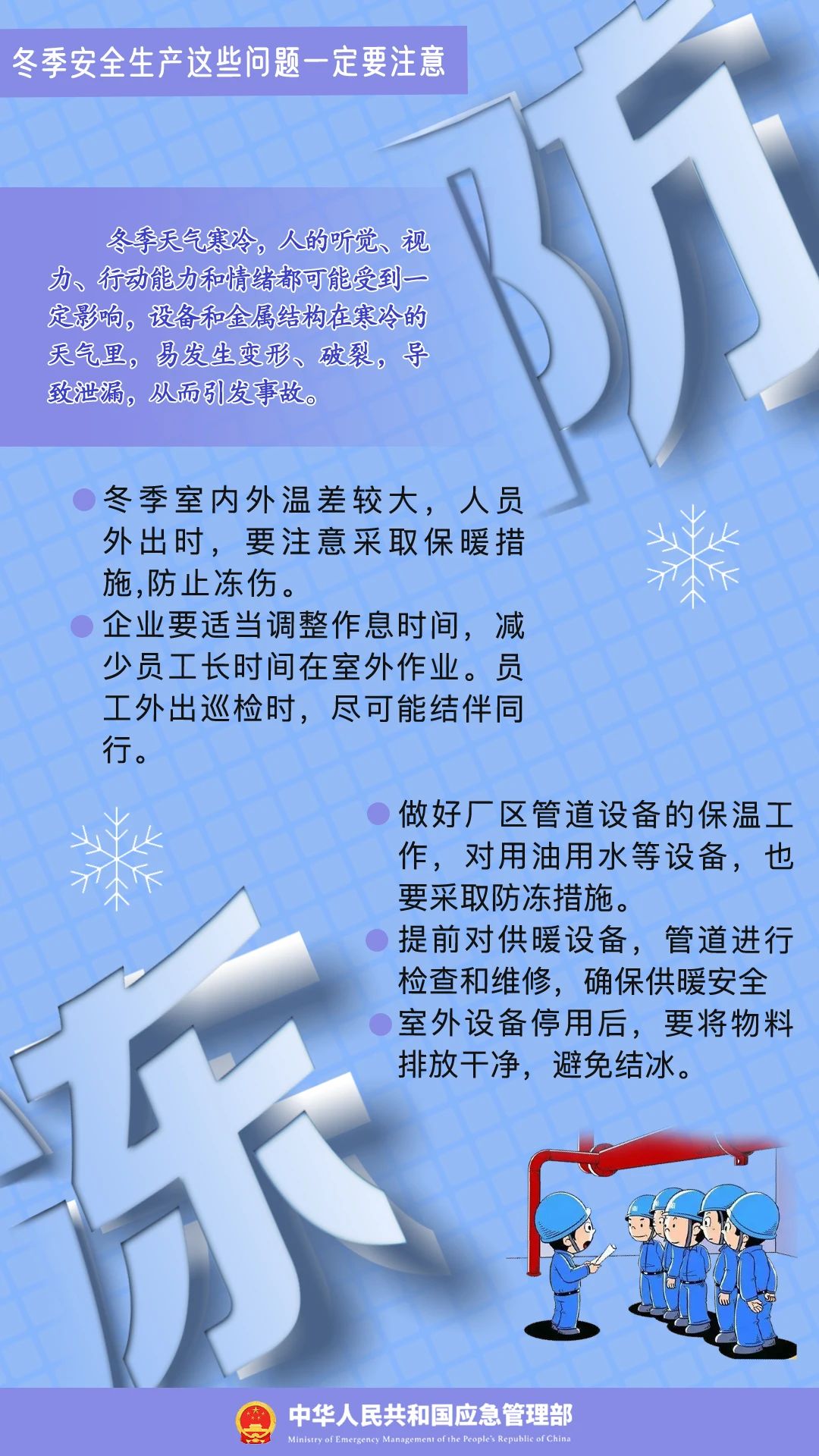冬季寒冷、干燥,容易發(fā)生凍傷、中毒、滑跌等人身傷害事故,給企業(yè)安全生產(chǎn)帶來(lái)影響。冬季安全生產(chǎn)要注意哪些問(wèn)題?一起學(xué)習(xí)↓↓↓