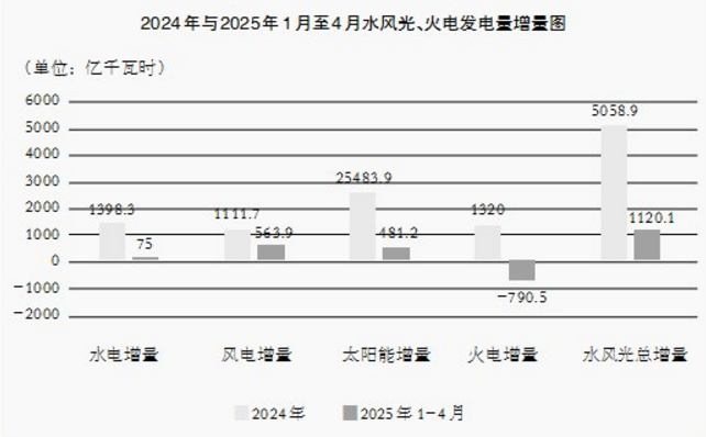 非化石能源替代已經成為能源結構優化調整的重點方向和中長期趨勢性選擇。近年來,能源行業深入貫徹落實碳達峰碳中和戰略,力爭在2030年前實現碳達峰目標。我國非化石能源實現了跨越式發展,風電、太陽能發電裝機規模快速增加,水電、風電、太陽能發電量逐年大幅增加,對煤炭等傳統能源替代作用越來越明顯。我國新能源發展經歷了10多年不斷創新培育,逐漸由起步階段向快速發展階段轉變,一批大型水電站陸續建成投產,一大批沙戈荒大型風電、光伏基地和海上風電、農村分布式光伏發電項目投入運營,水電、風電、太陽能發電量逐年大幅增加。2024年,水電、風電、太陽能發電量增量為5059億千瓦時,占全國發電量增量的79.9%。今年前4個月,全國水電、風電、太陽能發電量增量為1120.1億千瓦時,火電發電量同比減少790.5億千瓦時,非化石能源對傳統化石能源的替代作用顯著增強。